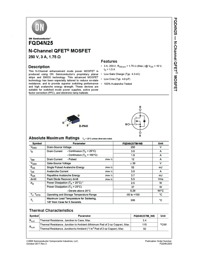 Power MOSFET, N-Channel, QFET<sup>®, 250 V, 3 A, 1.75 Ω, DPAK