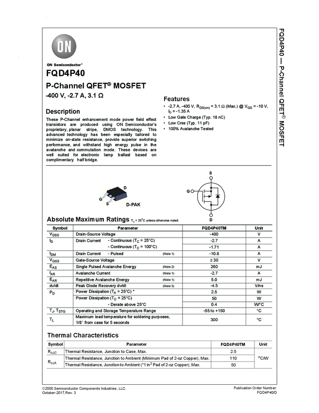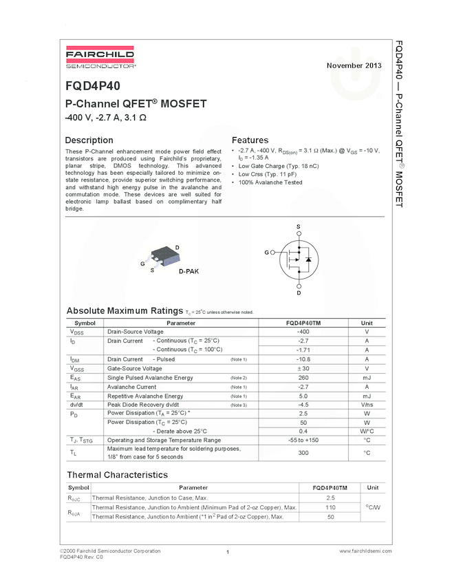 P-Channel QFET® MOSFET -400V, -2.7A, 3.1Ω