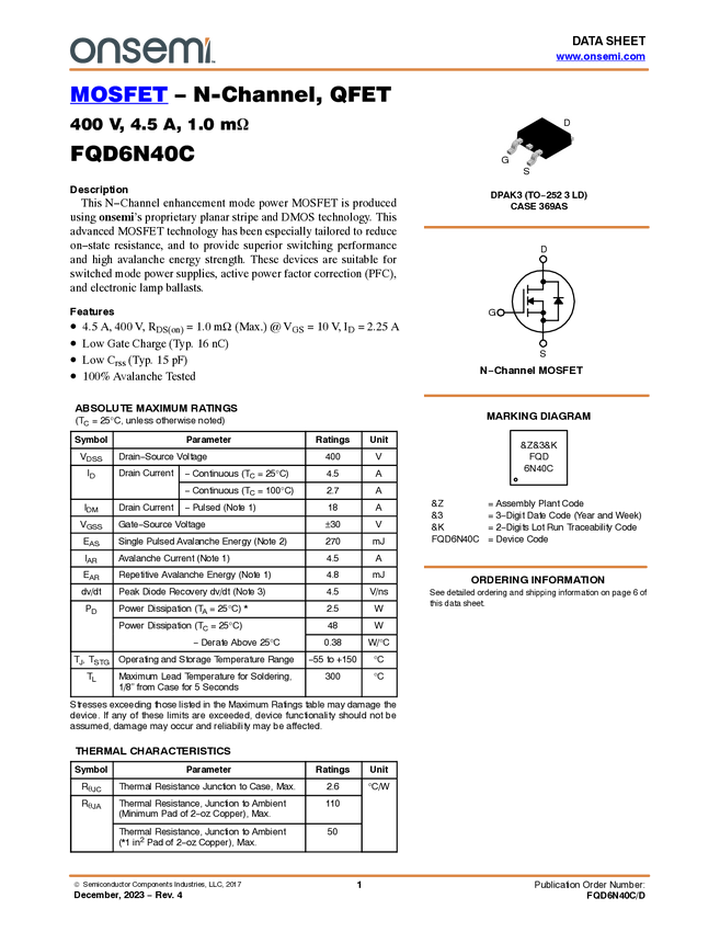 Power MOSFET, N-Channel, QFET<sup>®, 400 V, 4.5 A, 1.0 Ω, DPAK