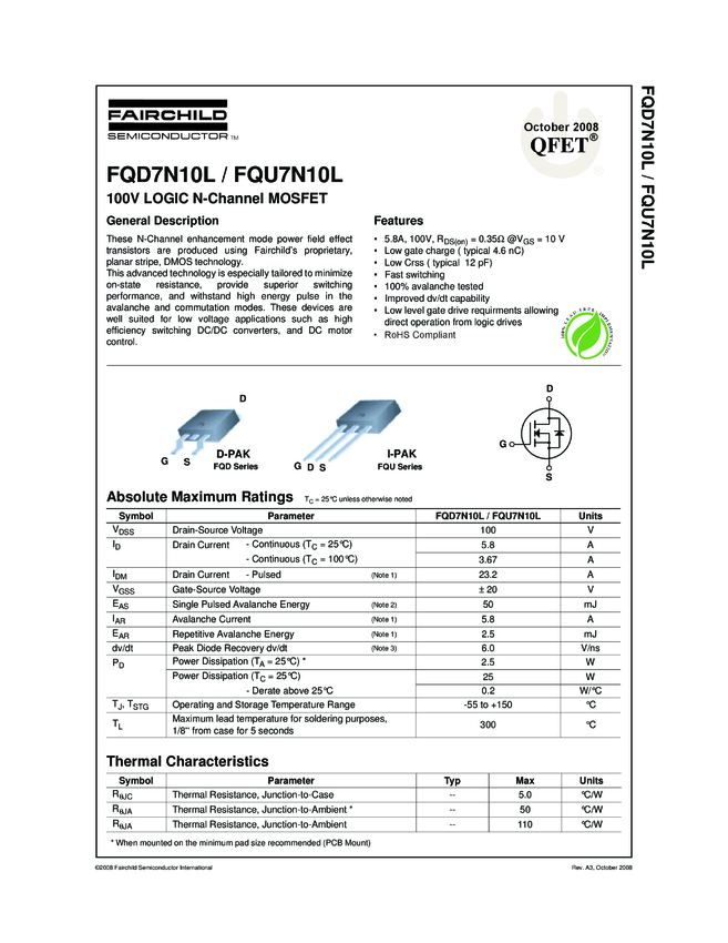 N-Channel QFET® MOSFET 100V, 5.8A, 350mΩ
