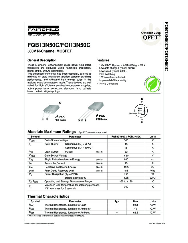 N-Channel QFET® MOSFET 500V, 13A, 480mΩ