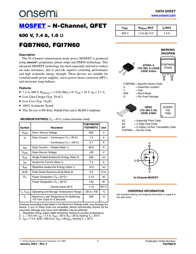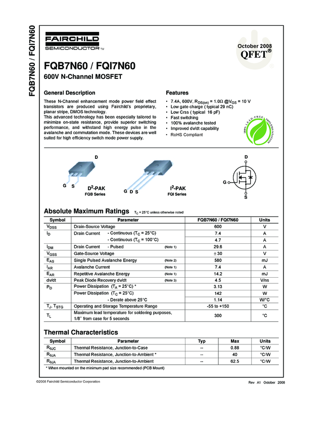 N-Channel QFET® MOSFET 600V, 7.4A, 1Ω