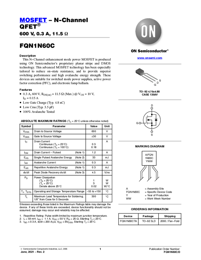 Power MOSFET, N-Channel, QFET<sup>®, 600 V, 0.3 A, 11.5 Ω, TO-92