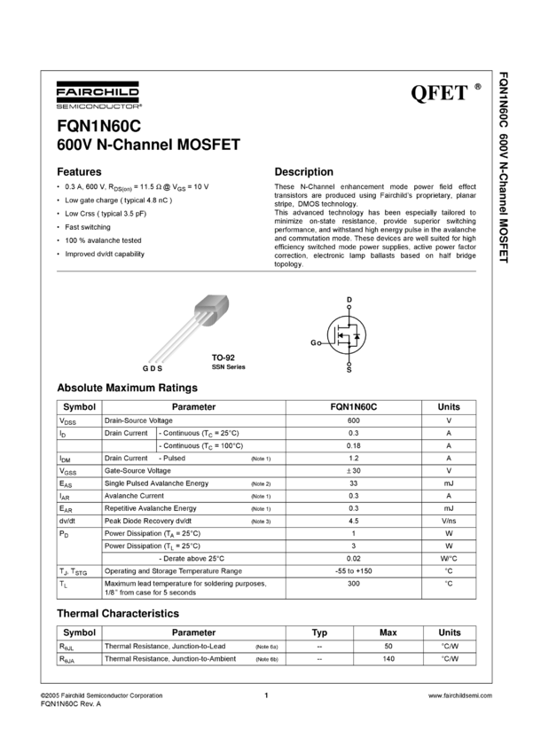 N-Channel QFET® MOSFET 600V, 0.3A, 11.5Ω