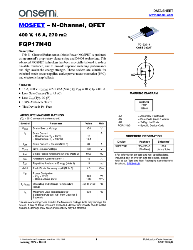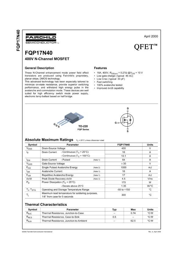 N-Channel QFET® MOSFET 400V, 16A, 270mΩ