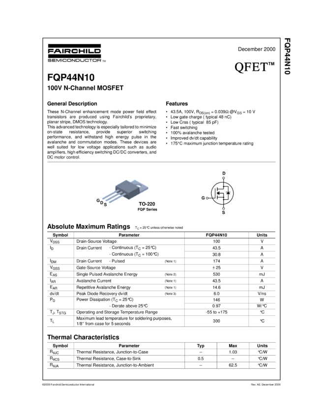 Power MOSFET, N-Channel, QFET<sup>®, 100 V, 43.5 A, 39 mΩ, TO-220