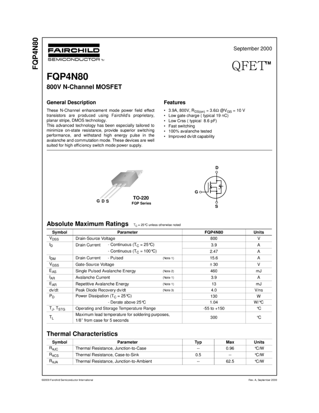 N-Channel QFET® MOSFET 800V, 3.9A, 3.6Ω
