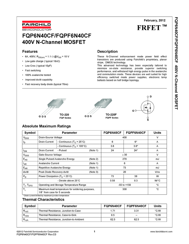 Power MOSFET, N-Channel, QFET<sup>®, FRFET<sup>®, 400 V, 6 A, 1.0 Ω, TO-220