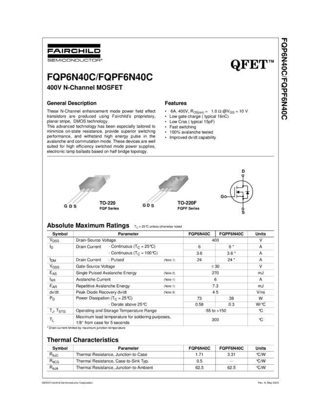 N-Channel QFET® MOSFET 400V, 6A, 1Ω