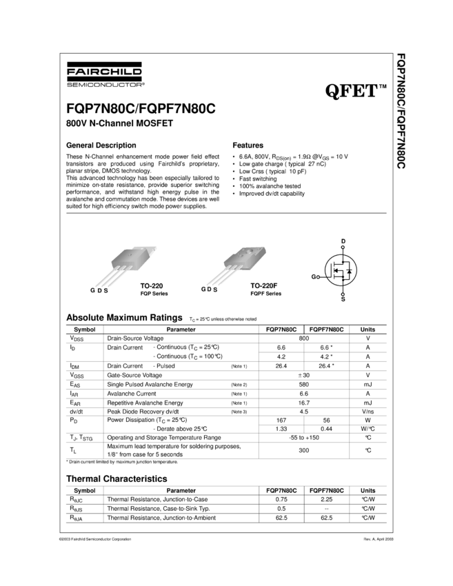 N-Channel QFET® MOSFET 800V, 6.6A, 1.9Ω