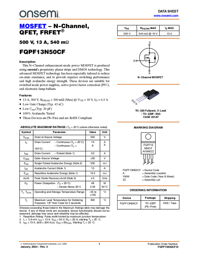 Power MOSFET, N-Channel, QFET<sup>®, FRFET<sup>®, 500 V, 13 A, 540 mΩ, TO-220F