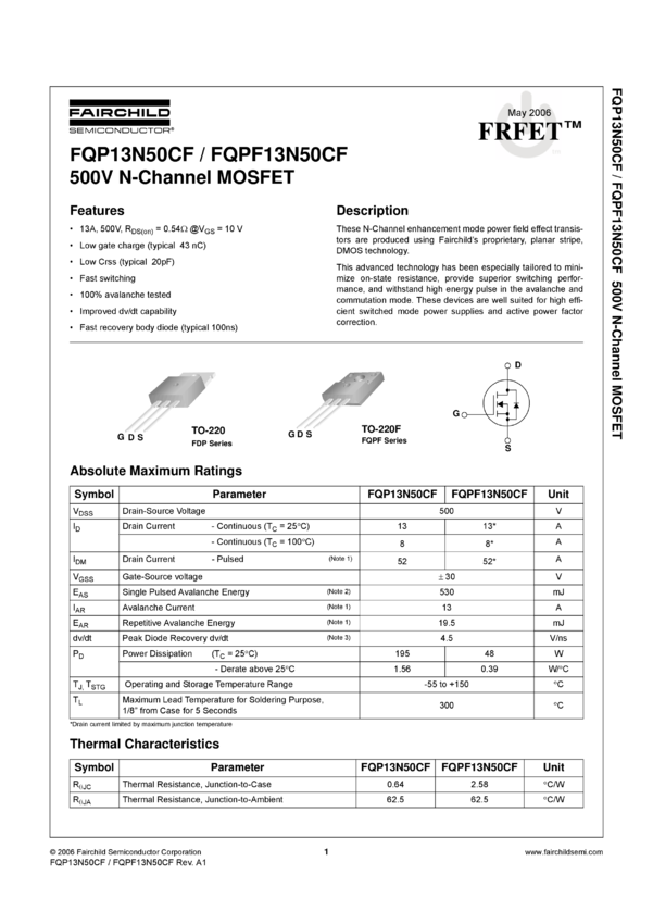 N-Channel QFET® FRFET® MOSFET 500V, 13A, 540mΩ