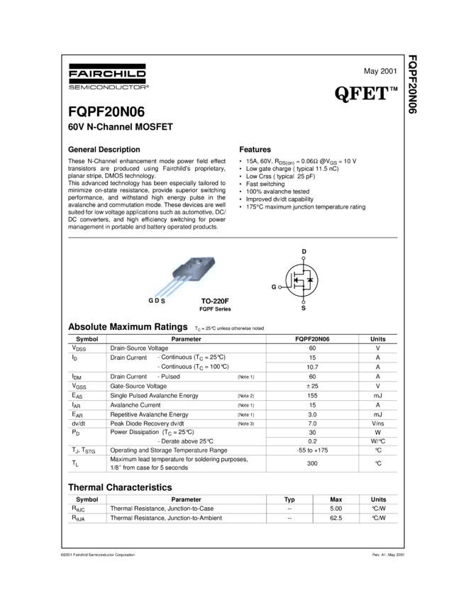 N-Channel QFET<sup>® MOSFET 60V, 15.7A, 52mΩ Power MOSFET, N-Channel, Logic Level, QFET<sup>®, 60 V, 15.7 A, 52 mΩ, TO-220F