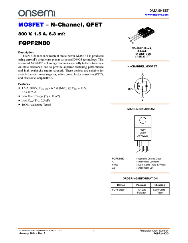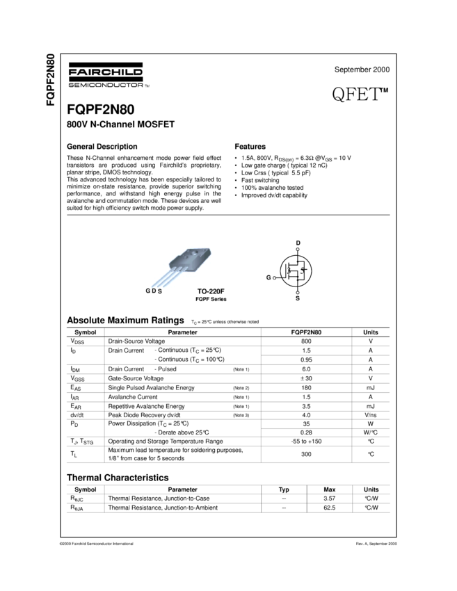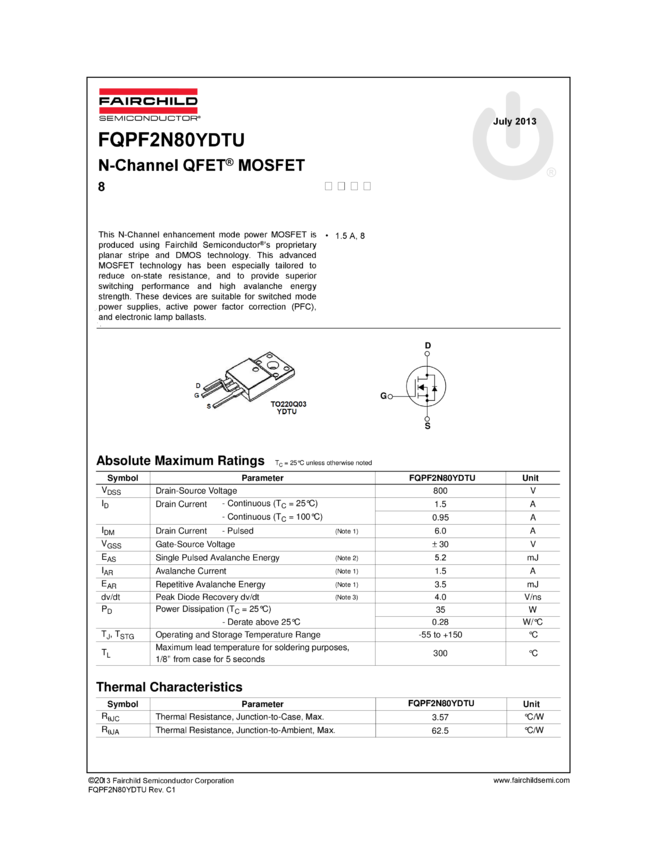 N-Channel QFET® MOSFET 800V, 1.5A, 6.3Ω