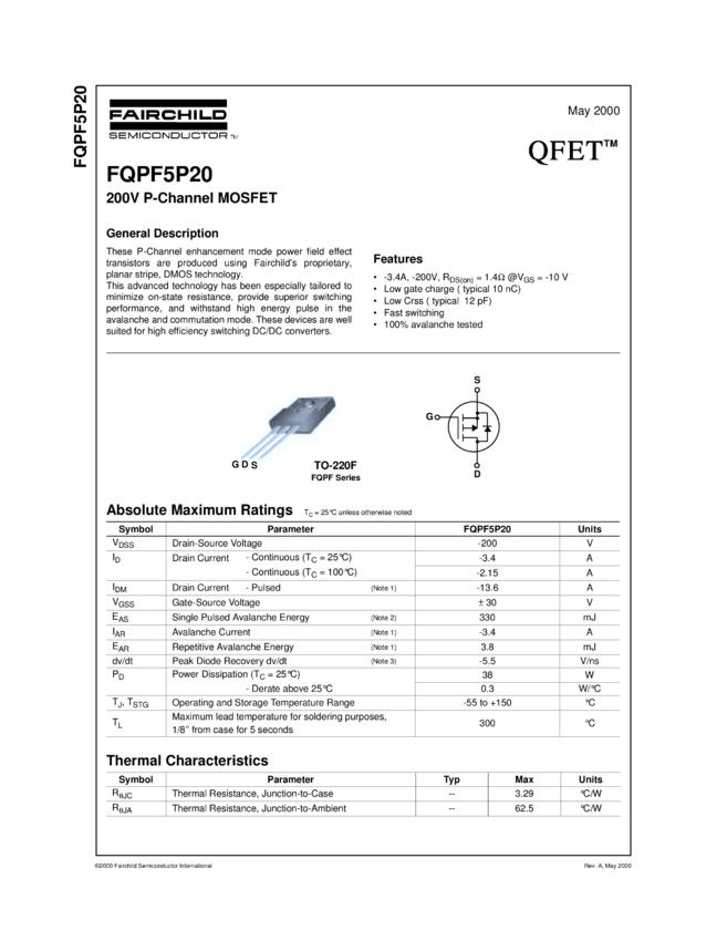 P-Channel QFET® MOSFET -200V, -3.4A, 1.4Ω