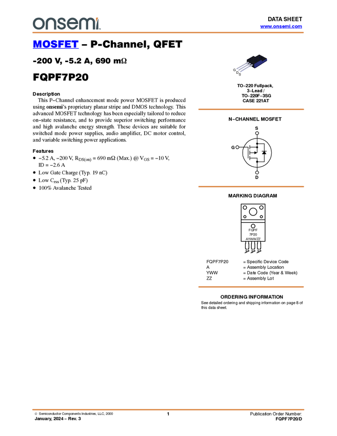 P-Channel QFET® MOSFET -200V, -5.2A, 690mΩ