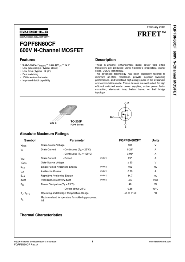 N-Channel QFET® FRFET® MOSFET 600V, 6.26A, 1.5Ω
