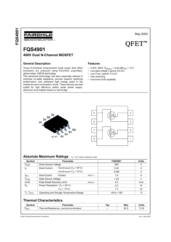 N-Channel QFET® MOSFET 400V, 0.45A, 4.2Ω