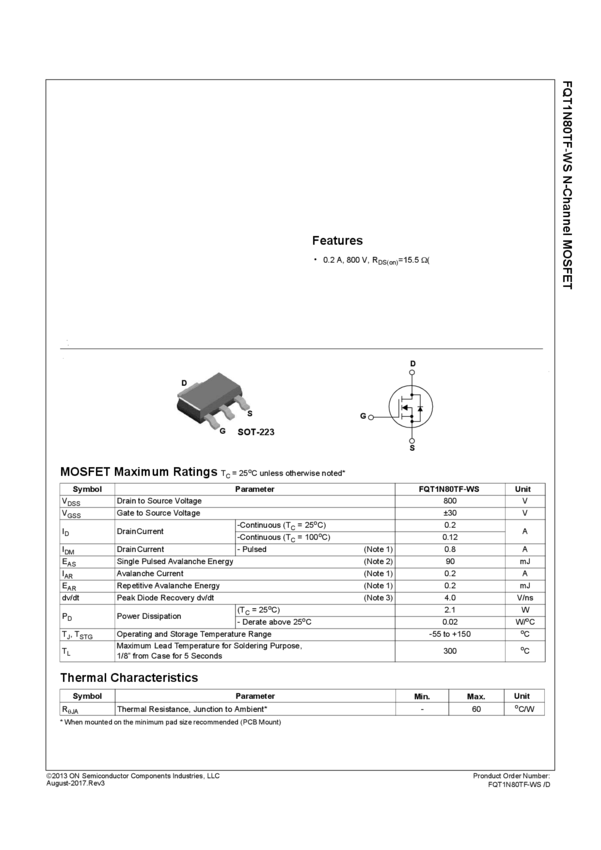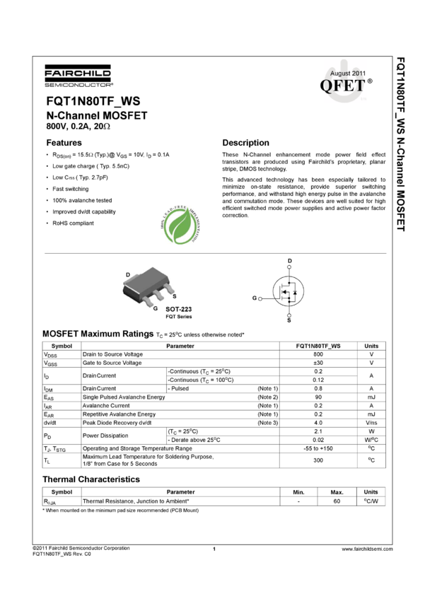 N-Channel QFET® MOSFET 800V, 0.2A, 20Ω