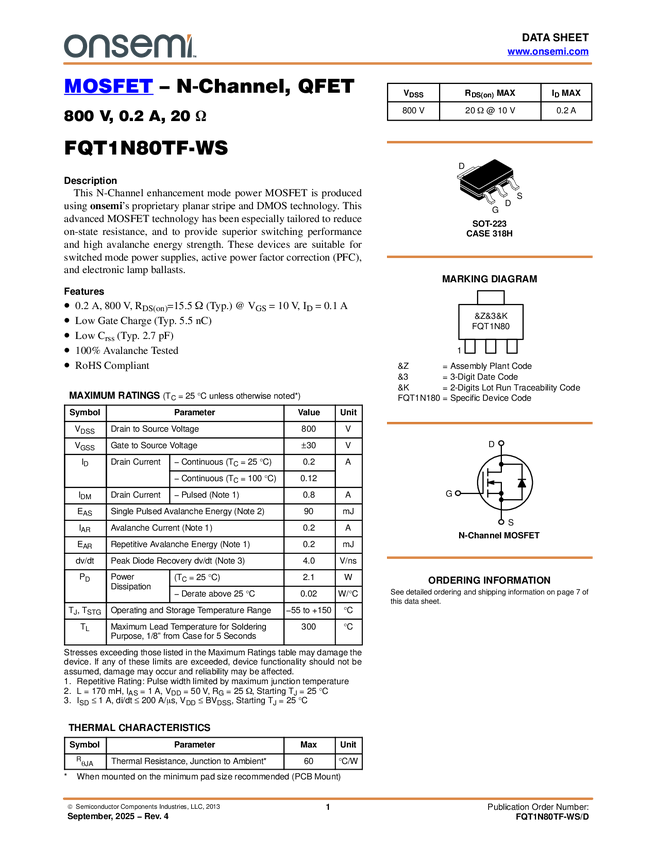 Power MOSFET, N-Channel, QFET<sup>®, 800 V, 0.2 A, 20 Ω, SOT-223