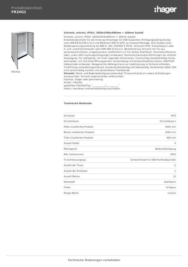 Szafka Hager, 1050 x 1950 x 400, stal, 1 szt.