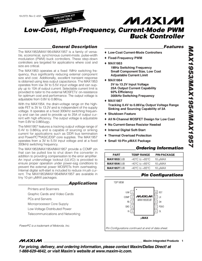 MAX1953, MAX1954, MAX1957 Low-Cost, High-Frequency, Current-Mode PWM Buck Controllers