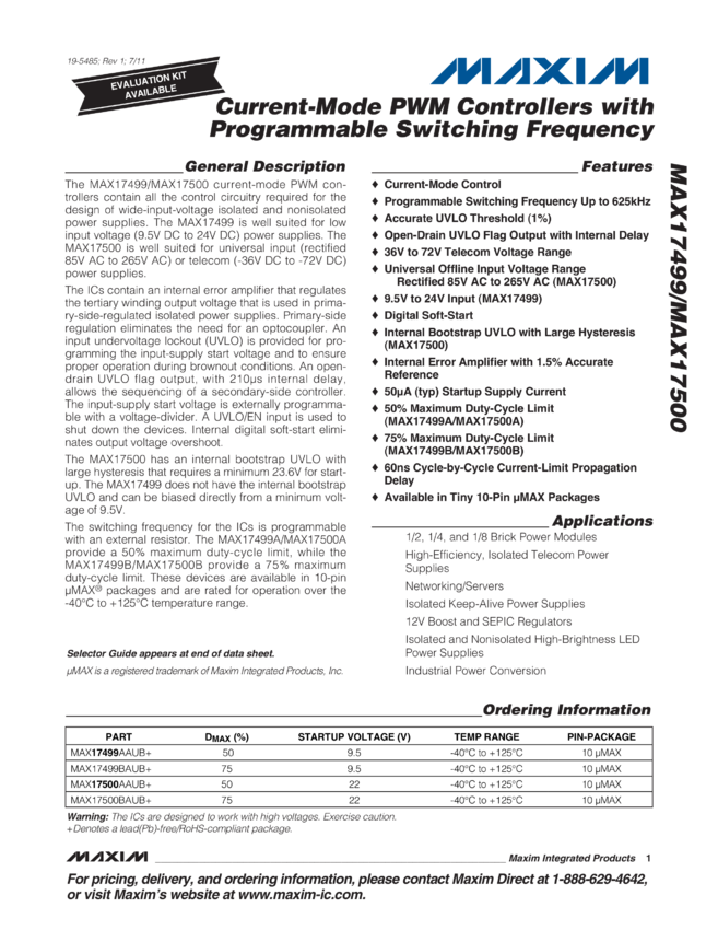 MAX17499, MAX17500 Current-Mode PWM Controllers with Programmable Switching Frequency