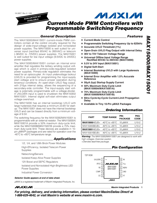MAX15000, MAX15001 Current-Mode PWM Controllers with Programmable Switching Frequency