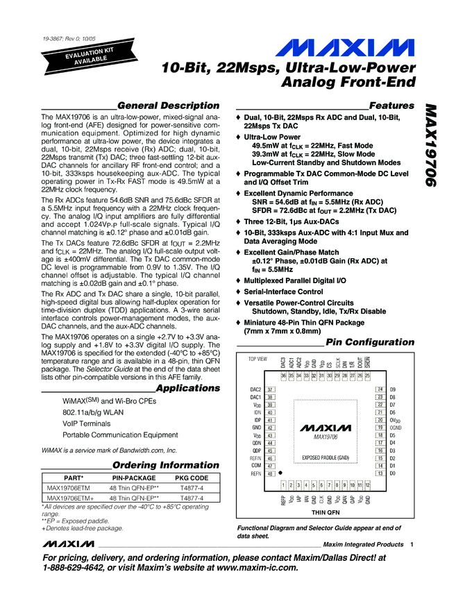 MAX19706 10-Bit, 22Msps, Ultra-Low-Power Analog Front-End