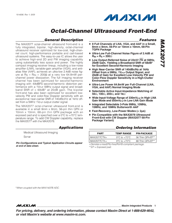 MAX2078 Octal-Channel Ultrasound Front-End with CW Doppler Mixers