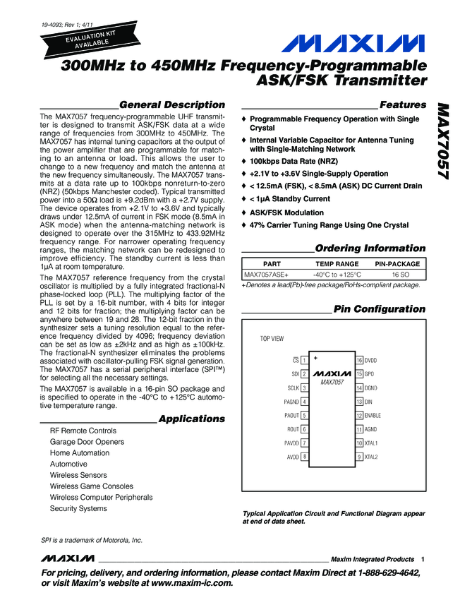 MAX7057 300MHz to 450MHz Frequency-Programmable ASK/FSK Transmitter