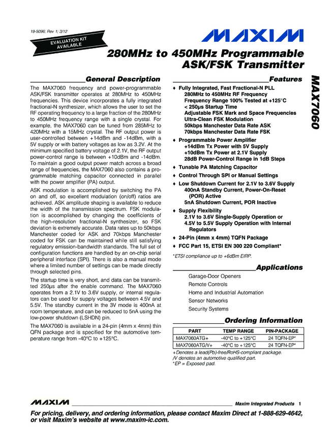 MAX7031 Low-Cost, 308MHz, 315MHz, and 433.92MHz FSK Transceiver with Fractional-N PLL