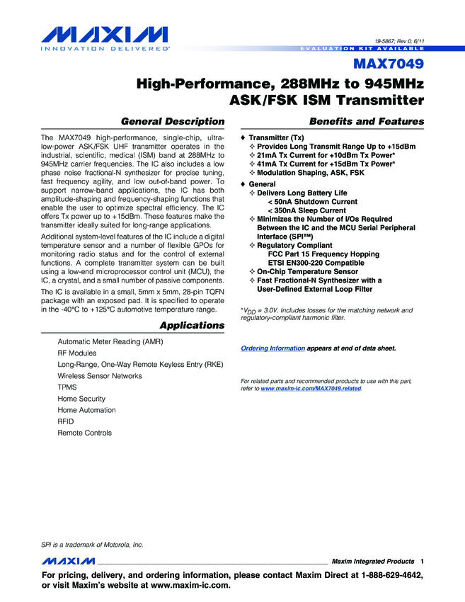 MAX7049 High-Performance, 288MHz to 945MHz ASK/FSK ISM Transmitter
