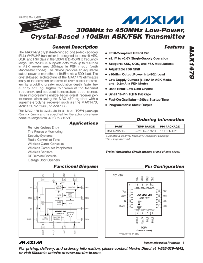 MAX1479 300MHz to 450MHz Low-Power, Crystal-Based +10dBm ASK/FSK Transmitter