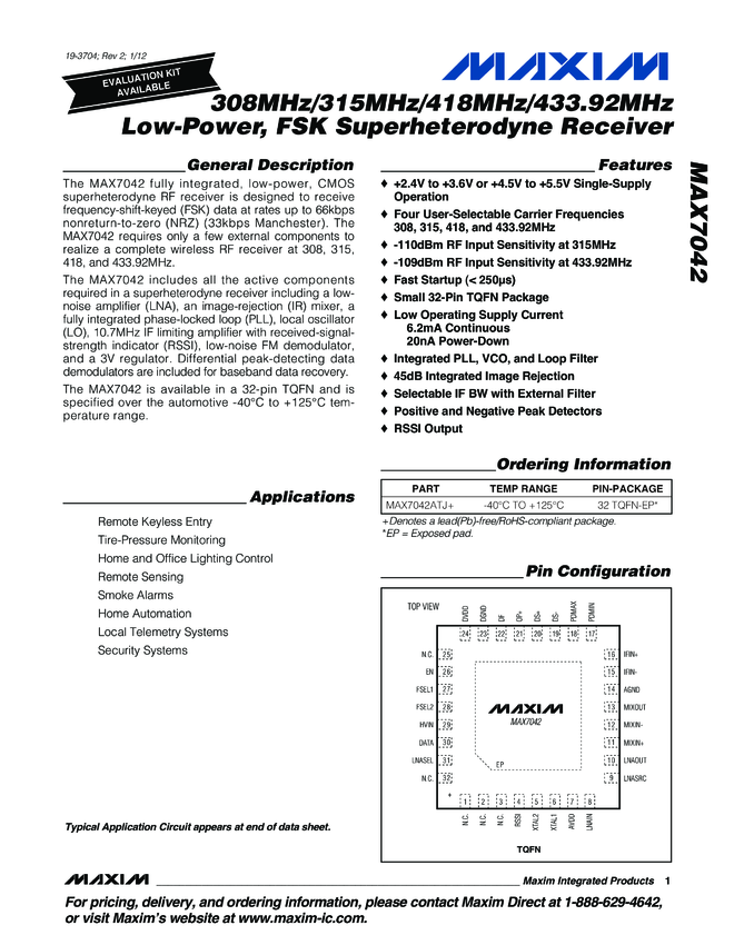 MAX7042 308MHz/315MHz/418MHz/433.92MHz Low-Power, FSK Superheterodyne Receiver