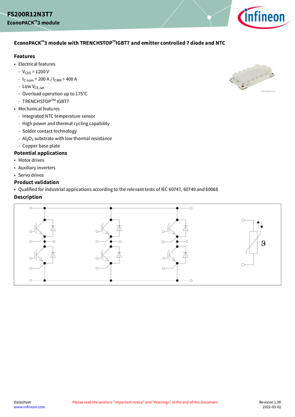 1200 V, 200 A sixpack IGBT module EconoPACK™ 3 1200 V, 200 A sixpack IGBT module with TRENCHSTOP™ IGBT7 , Emitter Controlled 7 diode and NTC.