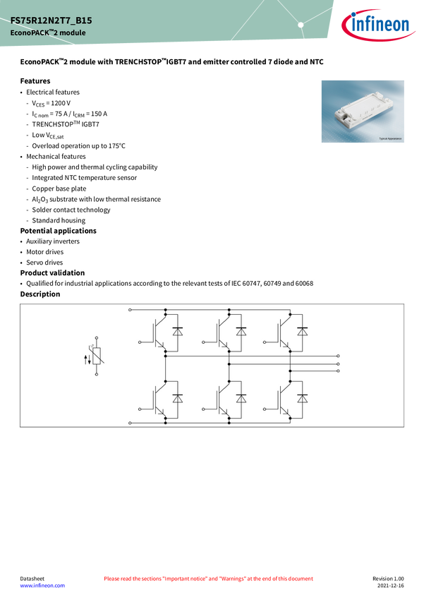 1200 V, 75 A sixpack IGBT module EconoPACK™ 2 1200 V, 75 A sixpack IGBT module with TRENCHSTOP™ IGBT7 , Emitter Controlled 7 diode and NTC (alternative mechnically compatible to an IGBT3 module).