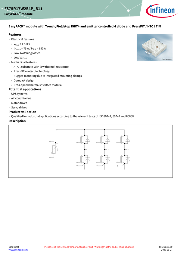 1700 V, 75 A sixpack IGBT module EasyPACK™ 2 1700 V, 75 A sixpack IGBT module with TRENCHSTOP™ IGBT4, Emitter Controlled diode, NTC, PressFIT Contact Technology and pre-applied Thermal Interface Material .