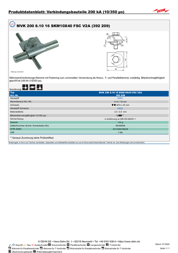 DEHN 392209 MVK 200 8.10 16 SKM10X40 FSC V2A Uniwersalny zacisk połączeniowy 1 szt.