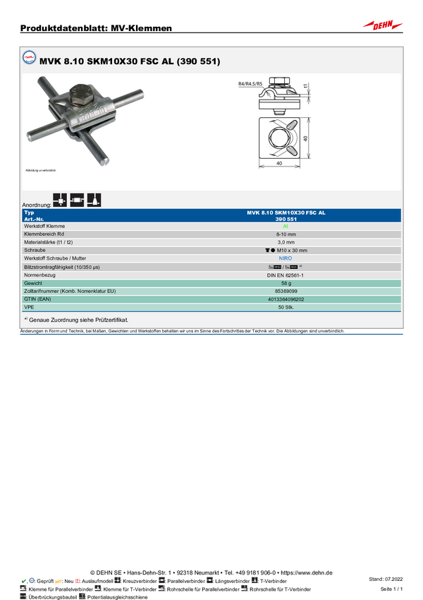 DEHN 390550 MVK 8.10 SKM10X30 FSC STTZN Zacisk MV 1 szt.