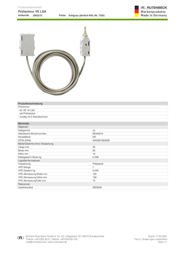 Przewód testowy LSA Rutenbeck Prüfschnur VE LSA 2903210, 1 szt.