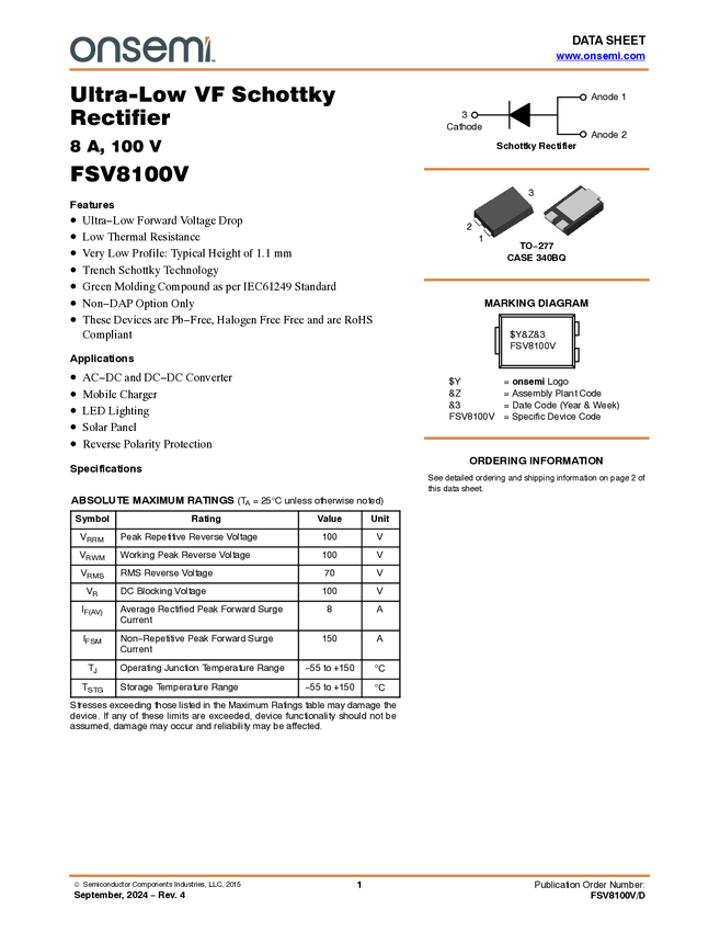 8 A, 100 V Ultra-Low VF Schottky Rectifier