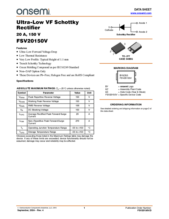 20 A, 150 V Ultra-Low VF Schottky Rectifier