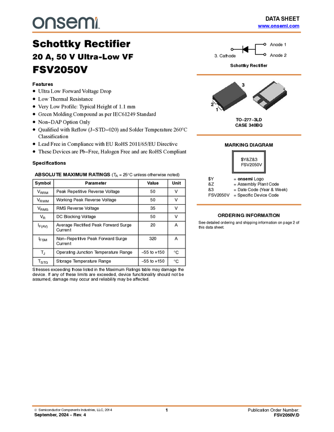 20 A, 50 V Ultra Low VF Schottky Rectifier