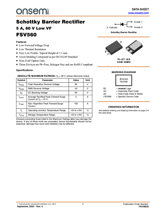 5 A, 60 V Low VF Schottky Barrier Rectifier