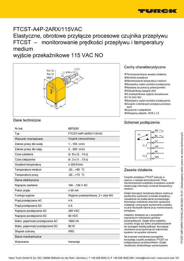 Turck 6870281 Czujnik zanurzeniowy FTCST-A4P-2ARX/115VAC, 104 - 126 V/AC, 1 szt.