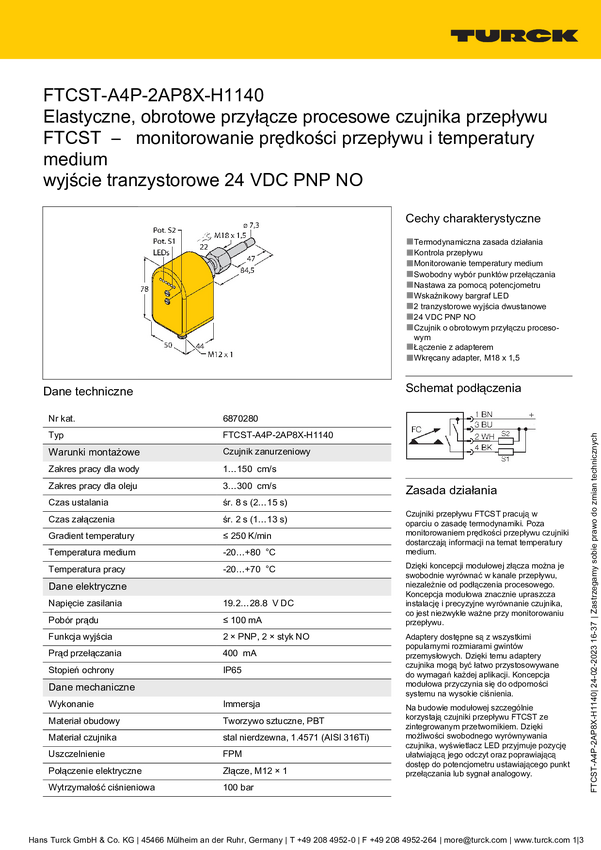 Turck 6870280 Czujnik zanurzeniowy FTCST-A4P-2AP8X-H1140, 19.2 - 28.8 V/DC, 1 szt.