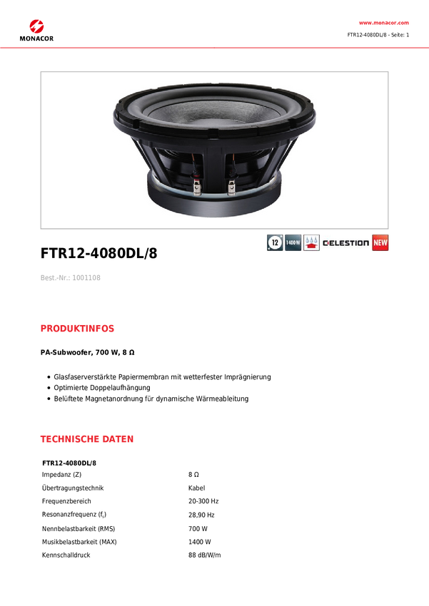 Subwoofer PA Monacor FTR12-4080DL/8 czarny