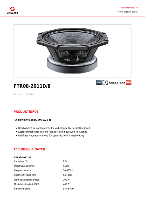 Głośnik nisko-średniotonowy Monacor FTR08-2011D/8 czarny