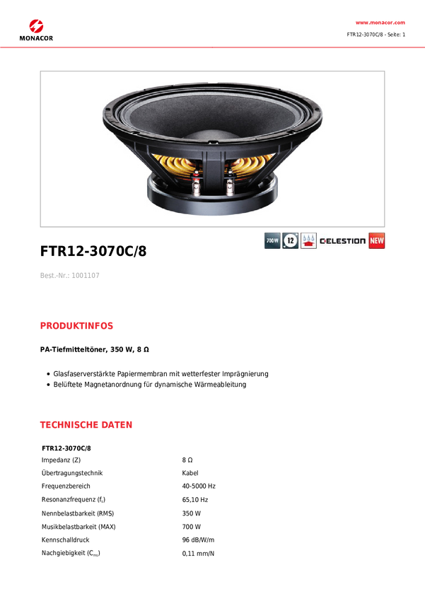 Głośnik nisko-średniotonowy Monacor FTR12-3070C/8 czarny